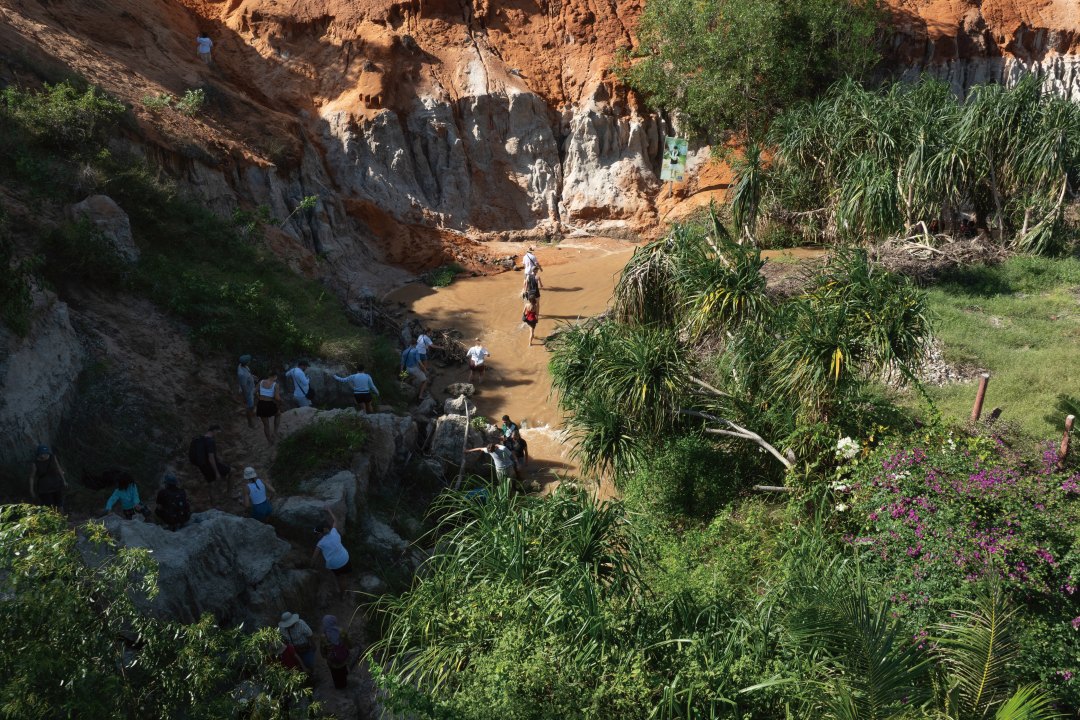 얕은 개울의 양옆으로 붉은 모래 절벽이 신비롭게 솟아 있는 계곡은 다소 비현실적이다. 건조한 땅에 일년 내내 물이 흐르고 심지어 탐험하듯 그 개울을 거슬러 올라갈 수 있으니 말이다. 요정들이 이 계곡의 물에서 목욕을 즐겼다는 전설 때문에 요정의 샘이라는 설도 있고, 위에서 내려다본 절벽이 마치 머리카락을 늘어뜨린 요정 같아서 그렇다는 얘기도 있다. 맨발을 물에 담그고 일렬로 전진하던 사람들은 본격적으로 계곡에 진입하자 인증샷을 남기기 시작한다. 한쪽에는 붉은 모래 언덕이, 다른 쪽에는 하얗게 바랜 석회암 절벽들이 협곡을 이루며 늘어서 있다. 풍화 작용에 의해 독특한 형태로 깎인 절벽은 높이가 15~20미터에 달한다. 그 기이한 모습 덕분에 ‘동양의 작은 그랜드 캐니언’이라는 별칭까지 얻었다. 절벽은 바람과 물이 빚어낸 조각품처럼 솟아 있고, 붉은 모래는 개울 바닥을 부드럽게 덮고 있다. 약 2킬로미터가량 물길을 거슬러가면 마지막에는 작은 폭포가 시원한 물소리를 내며 흘러내려온다. 신발을 벗고 물을 따라 걸으면 소망이 이루어진다는 전설도 있으니, 이 또한 요정의 샘을 제대로 즐기는 방법이겠다.