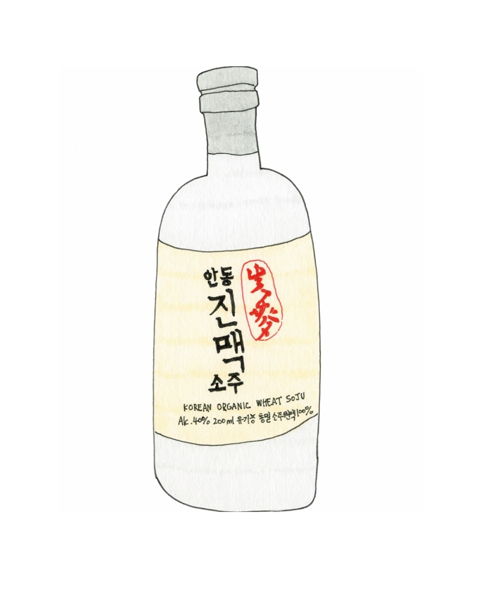 얕은 강물을 건너야 들어갈 수 있는 육지 속의 섬 안동 맹개마을에 10헥타르 면적의 밀밭이 있다. 맹개술도가의 박성호 이사는 가을에 이곳에 씨를 뿌려 이듬해 여름 추수한 밀로 ‘진맥소주’를 만든다. ‘진맥’은 밀의 옛 이름이다. 조선 시대 음식 조리서 〈수운잡방〉에 안동소주를 밀로 빚었다는 내용이 나온다. 진맥소주는 밀누룩과 통밀을 섞어 삼양주 방식으로 빚은 다음 상압식 동 증류기에서 두 차례 증류하고 이를 1년 이상 저온 숙성한다. 농사부터 술이 되기까지 최소 2년이 걸리는 것이다. 진맥소주는 쌀이나 찹쌀을 주원료로 하는 안동소주와 향부터 다르다. 고소하고 화사한 향이 코끝에 확 밀려들어온다. 구운 토스트 향과 바나나 향이다. 원액에 가까운 53도 증류주는 부드럽다 못해 오일리하게 넘어간다. 밀의 재탄생이자, 안동소주의 재발견이다.