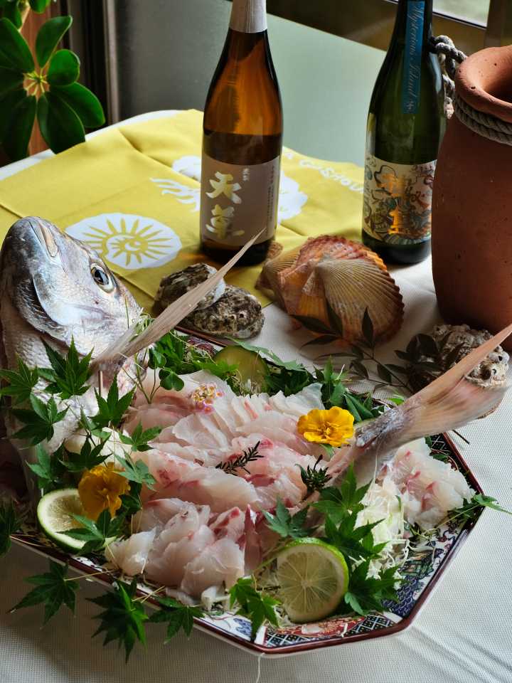 고쇼우라만의 매력을 발견하기 위해선 ‘프리미엄 해산물 런치(최소 6인 그룹 기준 1인 1만 4,400엔)’ 만한 것이 없다. 어부의 어머니들이 로컬 식자재로 만든 음식을 맛볼 수 있는 팝업 레스토랑으로, 날씨만 허락한다면 카라수토게 인근, 섬 정상에 풍성한 식탁이 차려진다. 조개와 폐그물 등을 활용한 테이블 장식부터 푸른색 유리 그릇에 담긴 타코메시(たこ飯, 문어밥), 해초튀김, 직접 빚은 모과주까지, 어느 것 하나 허투루 대접하고 싶지 않은 섬사람의 마음이 담겨 있다. 오전에 바다 낚시 체험에 참가해 대형 돔이라도 한 마리 낚았다면, 여기에 신선한 통사시미가 더해질 것이다. 런치의 진짜 하이라이트는 빨간 두건과 앞치마를 두르고 손수 음식을 내주는 귀여운 어머니들이다. 수줍은 미소 너머 섬에 대한 애정과 자부심 가득한 얼굴을 마주하면 고쇼우라에 꼭 와야 할 이유를 발견하게 될 것이다.