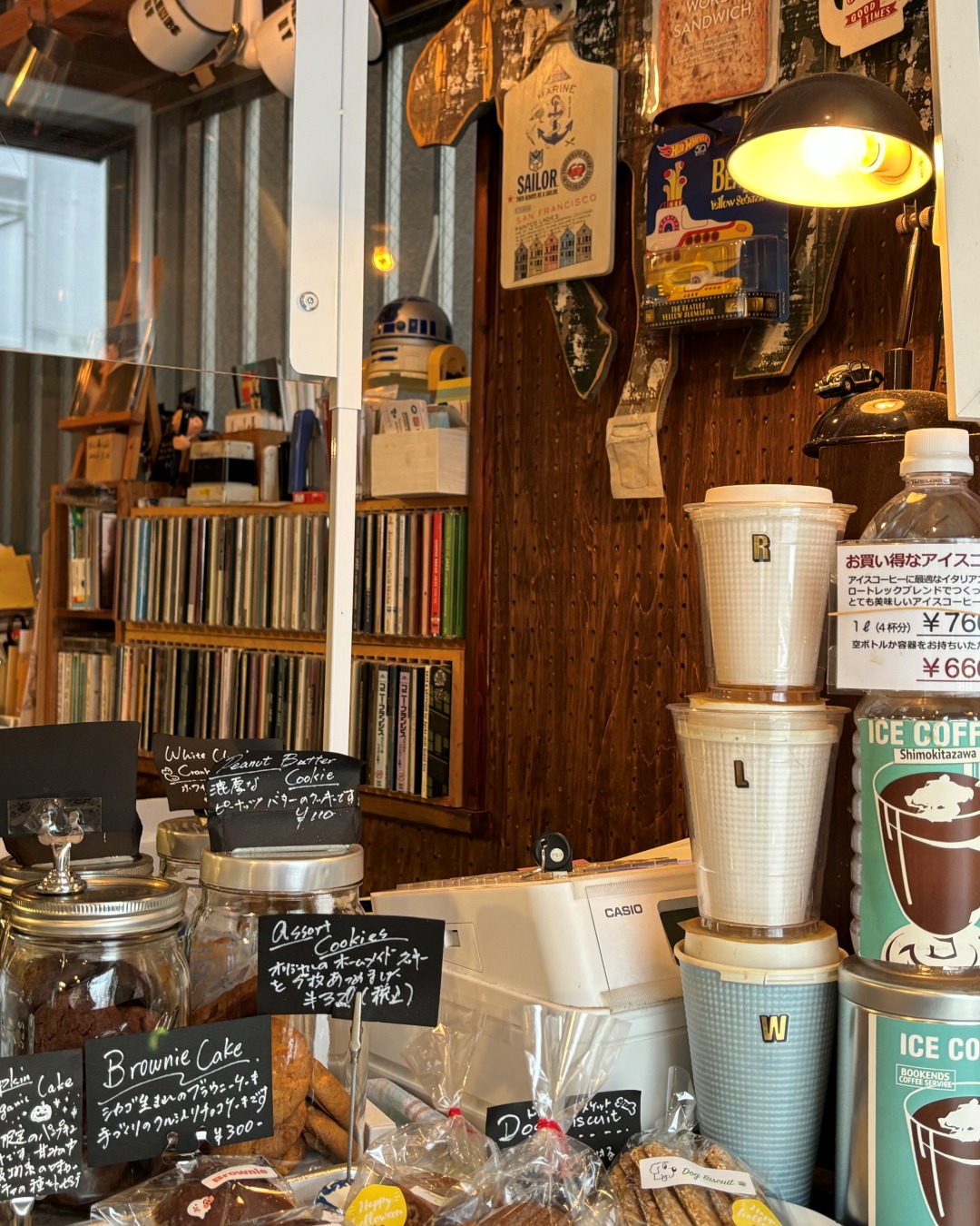 길을 걷다 우연히 발견한 작은 골동품 가게에 입꼬리가 올라가는 사람이라면 틀림 없이 좋아할 만한 카페다. 세월의 흔적이 묻어나는 간판과 주황빛 전구 조명, 빼곡히 채워진 CD 장에서 한 장씩 꺼내 틀어주는 재즈와 올드 팝, 좁은 내부에 오목조목 놓인 책상과 의자, 벽에 붙은 포스터와 메뉴판이 뒤섞여 왠지 모를 사랑스러움이 묻어난다. 1958년에 도쿄 츠키시마(月島)에서 원두 도매 전문 회사로 시작한 라이브 커피(LIVE COFFEE)와 파트너십을 맺고 2014년 시모키타자와에 문을 열었다. 그때부터 지금까지 동네 주민에게 사랑받는 카페로 한자리를 지키고 있는 것. 오직 북엔즈 커피 서비스에서만 찾을 수 있는 시모키타자와 블렌드는 여행 기념품으로도 손색없다. 핸드 드립 커피 한 잔이 350엔으로, 높은 가격대의 커피가 부담스러운 이에게 완벽한 선택지다.