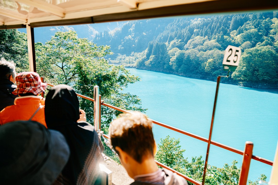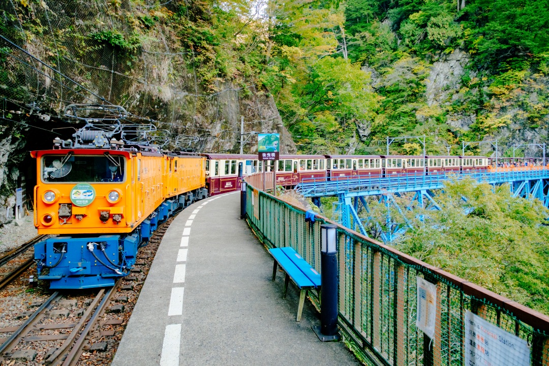 협곡의 강물을 이용해 전력을 얻으려는 한 세기 전의 시도가 오늘날의 협곡 철도를 만들었다. 1923년부터 단계적으로 개통됐고, 댐 공사가 끝난 후 1970년대부터는 관광열차로 운행되기 시작했다. 우나즈키역(宇奈月駅)을 출발한 앙증맞은 토롯코(トロッコ) 열차는 과거의 정서를 고스란히 재현한다. 댐과 발전소를 짓기 위해 개척한 철로를 따라 토롯코는 슬금슬금 쿠로베 협곡 안으로 달려 들어간다. 야마비코(山彦) 다리를 건넌 열차의 우측으로 서서히 보이는 협곡의 숨은 경치는 압권이다. 울긋불긋한 단풍이 짙은 숲을 이뤄 층층이 겹쳐지고, 그 아래를 드세게 흐르는 쿠로베강 옥색으로 반짝인다. 이른 시간부터 그림자가 드리운 깊은 협곡 속에는 살짝 산짐승의 움직임이 보이는 것 같기도 하다. 터널을 반복하며 나올 때마다, 탑승객들은 쿠로베 협곡을 향해 감탄을 내뱉는다.
