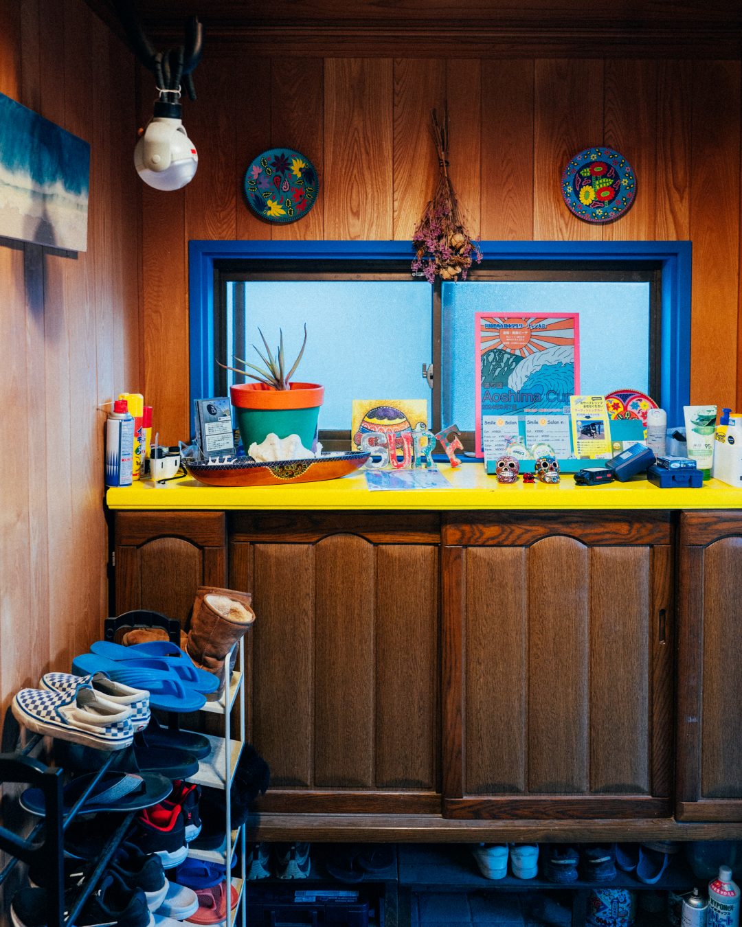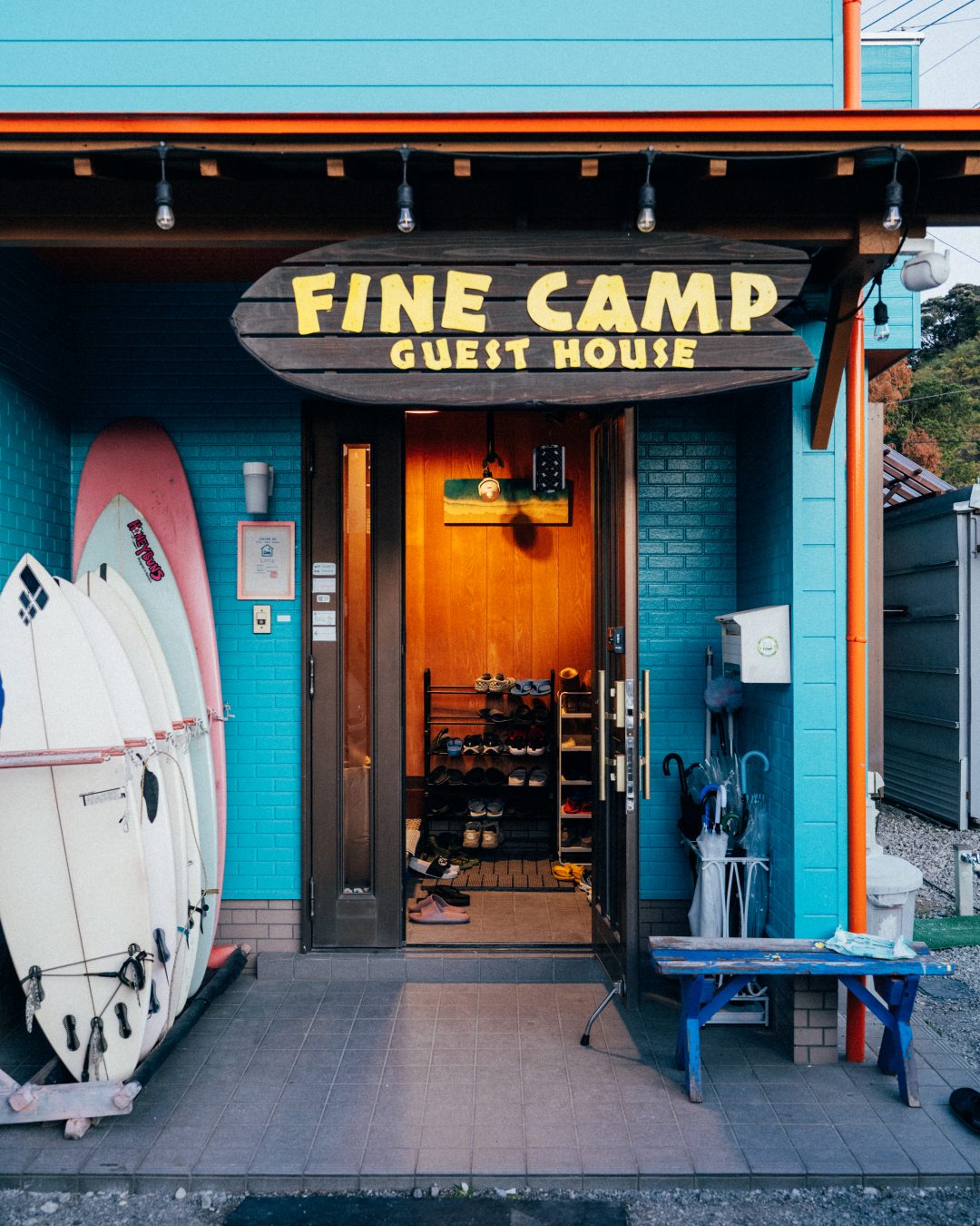 해변과의 접근성, 야외 샤워 시설, 장비 보관 장소, 현지 파도 정보 공유. 파인캠프 게스트하우스는 서핑 여행의 베이스캠프가 갖춰야 할 모든 요소를 충족하는 곳이다. 숙소에서 무료로 제공하는 자전거를 이용하면 키사키하마, 아오시마의 서핑 포인트까지 10분 이내에 갈 수 있고, 숙소 입구에 냉온수 샤워 시설이 마련돼 있으며, 널찍한 보드 창고와 슈트를 말릴 수 있는 마당까지 갖췄다. 미야자키의 서핑 문화에 반해 7년 전 이주한 한국인 김석철 씨가 역시 서핑을 위해 교토에서 이주한 일본인 아내와 운영하는 곳이니, 현지 서핑 정보에 관해서라면 걱정 없다. 투숙객을 대상으로 서핑 강습도 진행하니 초심자라면 더욱 추천할 만하다. 바다를 닮은 파란색 건물 2층에 3개의 도미토리 객실과 주방 겸 공용 공간이 있고, 키사키하마 인근에 최대10인까지 머물 수 있는 독채 펜션도 함께 운영한다.