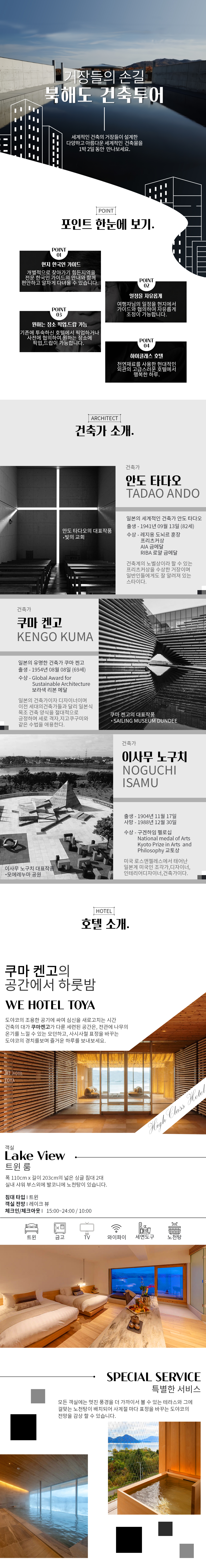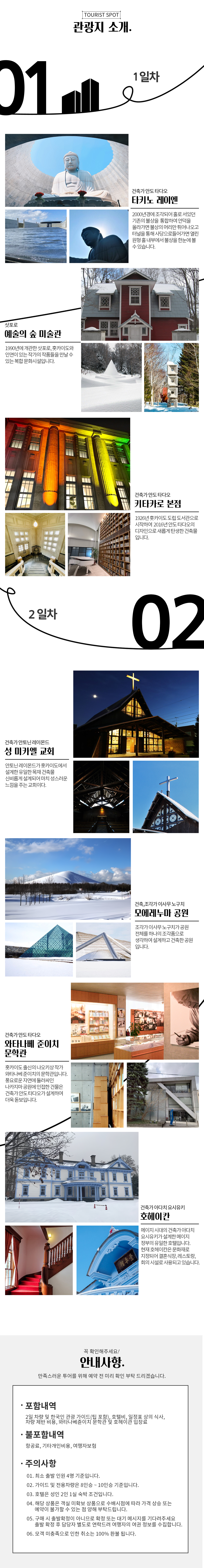 홋카이도를 여행하는 동안 색다른 영감을 얻고 싶은 당신을 위한 추천 투어! 안도 타다오, 쿠마 켄고 등 세계적인 일본 건축 거장의 건축물을 방문하고, 자연 속 디자인 호텔에서 휴식하는 1박 2일 홋카이도 건축 테마 투어입니다. 개별적으로 찾아가기 번거로운 건축 명소를 한국인 가이드와 함께 편리하고 깊이 있게 둘러보세요.