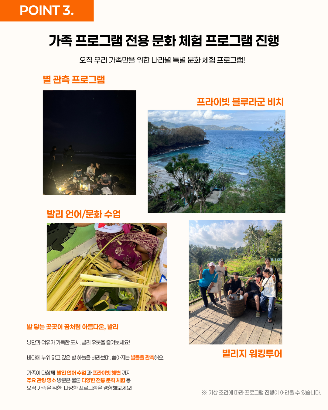 - 인원 : 가족당 최소 2인 / 여행 출발 최소 4인
