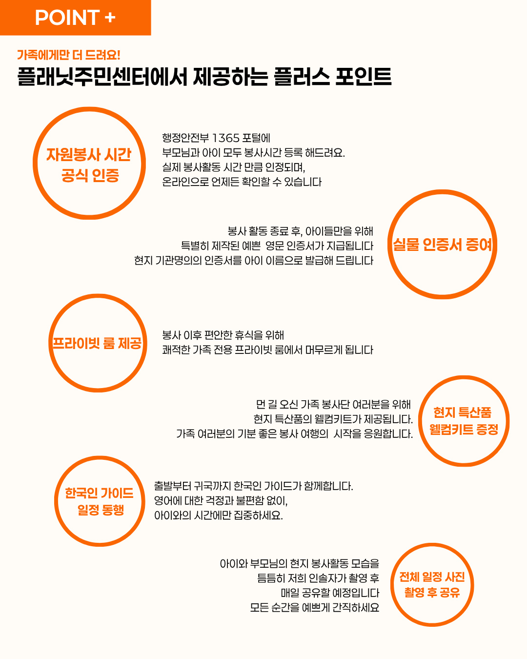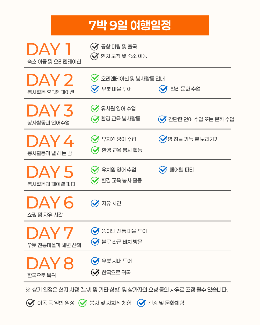 - 포함 사항 : 전 일정 숙박, 전 일정 식사, 공항 픽업-드롭, 한국인 가이드, 현지 이동 비용, 입장료, 여행자 보험, 봉사활동 종료 후 국영문 봉사활동 인증서 제공(실제 활동시간 적용)