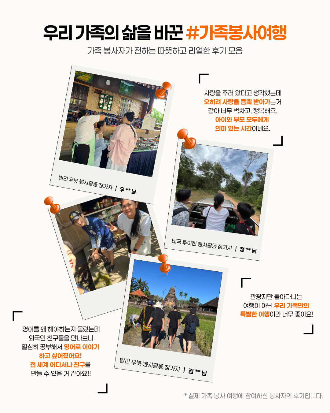 - 국내외 봉사 여행 전문 여행사가 준비하고, 한국인 가이드가 함께해 해외 봉사 첫 여정으로 안성맞춤