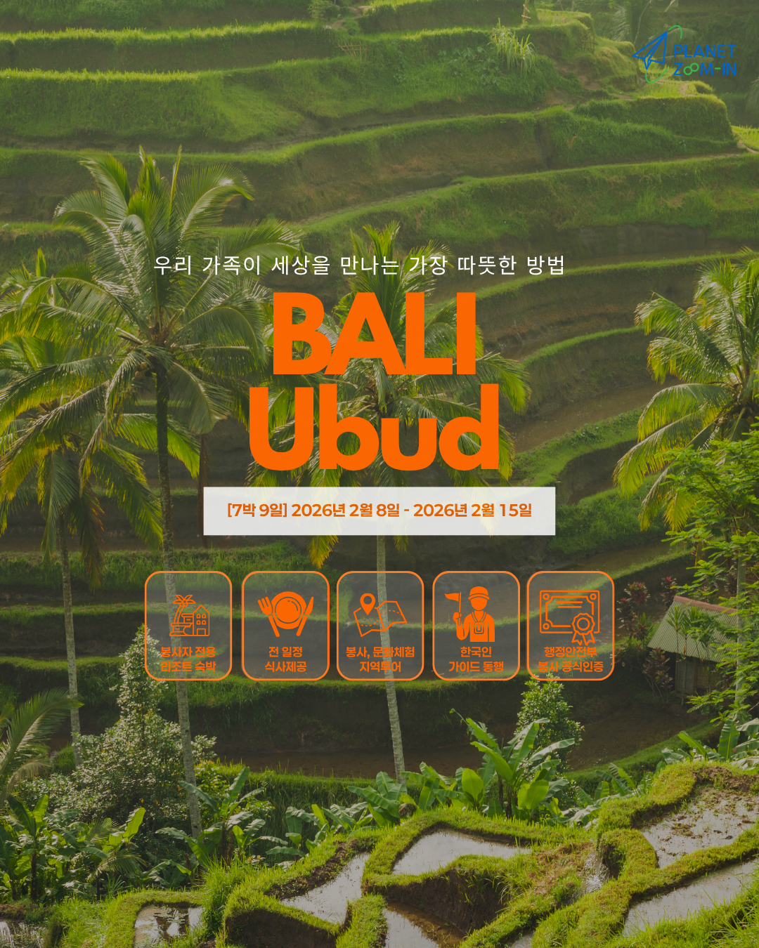 우붓에서 가족이 함께하는 7박 9일 해외 봉사 여행! 발리 유치원에서의 봉사활동과 함께, 블루 라군 비치와 전통 마을 방문, 발리 문화 수업 등 다채로운 문화 프로그램이 포함되어 봉사와 여행의 즐거움을 모두 누릴 수 있습니다. 현지 아이들과의 교류를 통해 아이는 물론 가족 모두가 함께 성장하는 뜻깊은 여정. 의미 있는 겨울 여행을 찾는 가족에게 추천합니다.