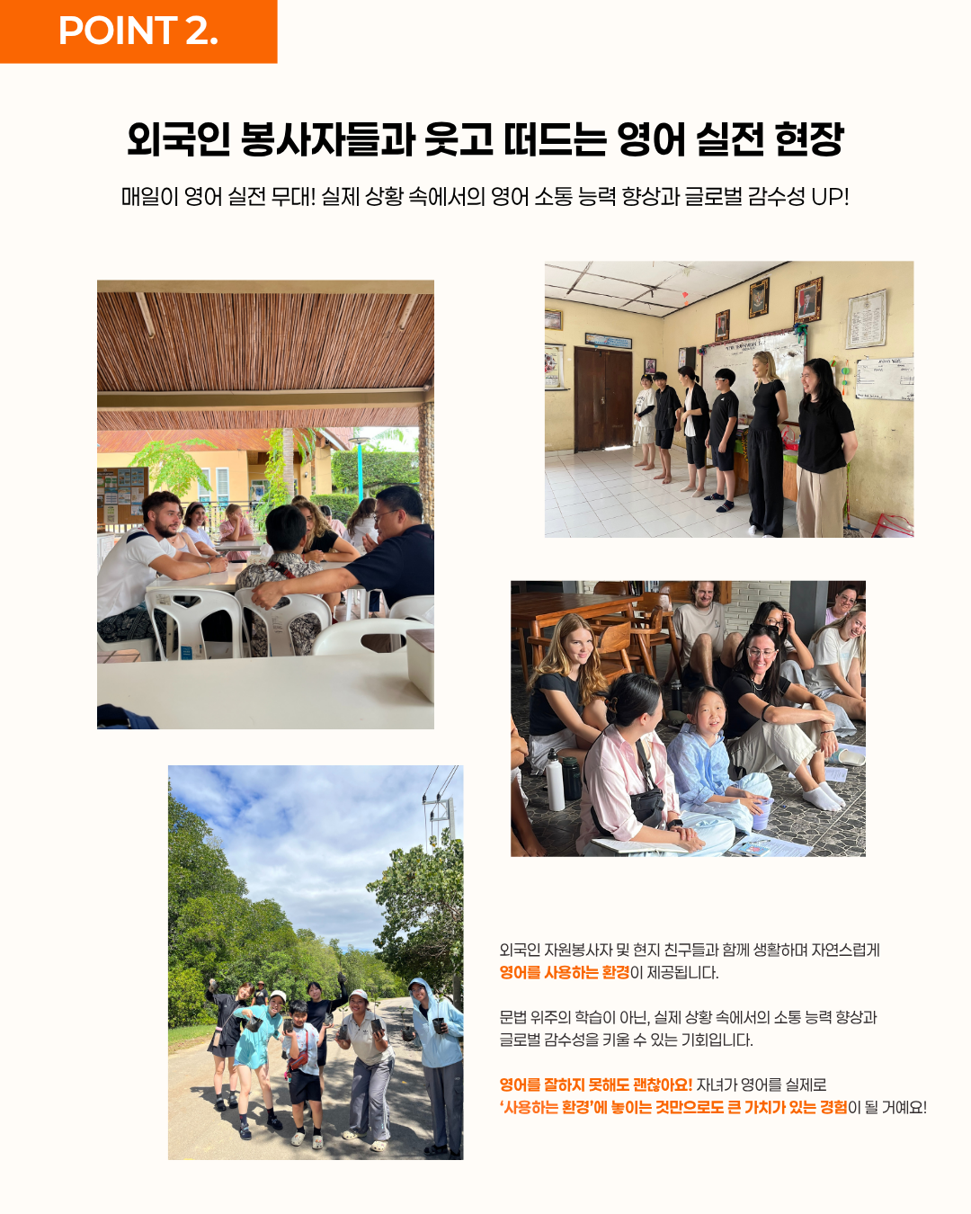 - 해외 각국에서 온 봉사자들과 어울리며 자연스럽게 영어를 사용할 수 있는 환경 조성